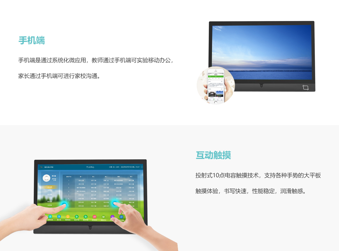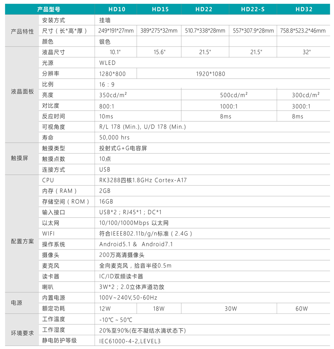 采用安卓四核或八核高性能处理器,投射式10点电容触摸技术,灵敏度超高,定位精准;内置高清200W摄像头,自带IC ID双频14443A读卡器,支持人脸识别和刷卡考勤。